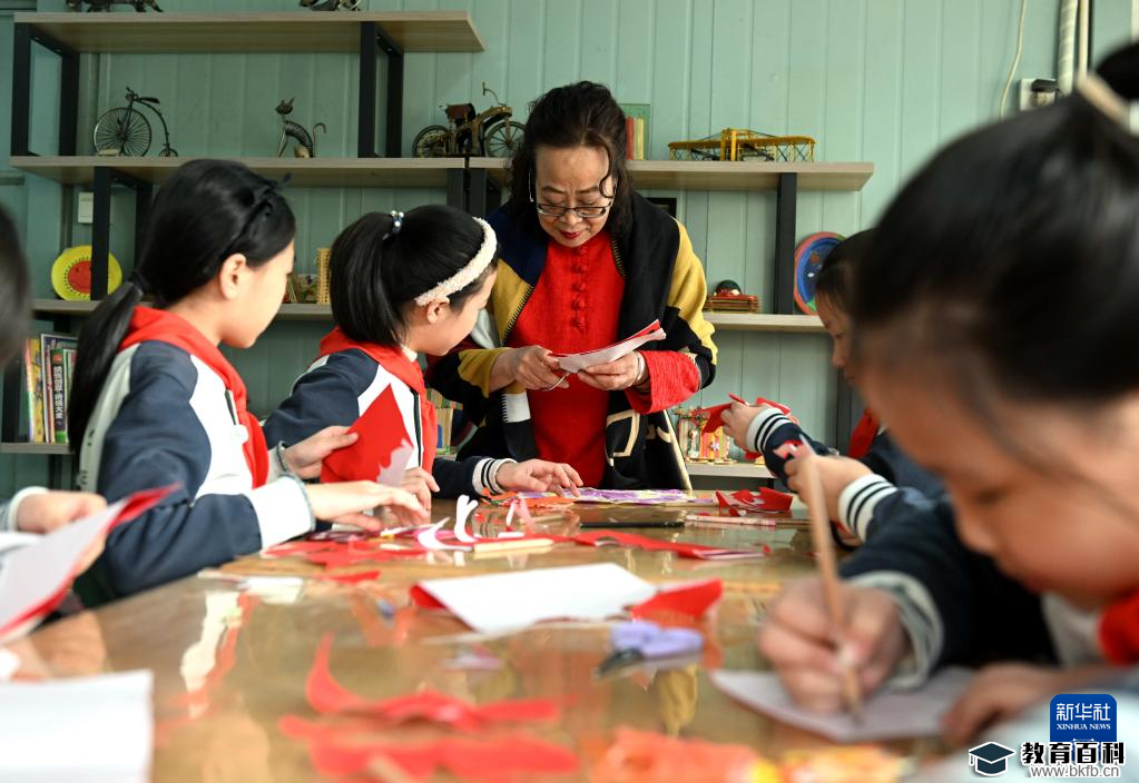 2月28日,國(guó)家級(jí)非遺蔚縣剪紙代表性傳承人周淑英(左三)在石家莊市東風(fēng)小學(xué)非遺工坊給學(xué)生傳授剪紙技藝。